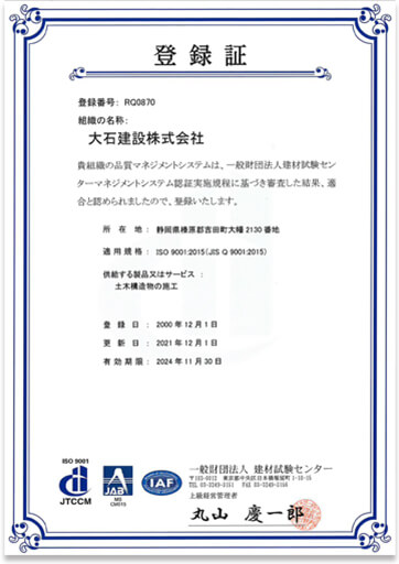 常に技術を磨き、要求事項を満たすと共に品質システムの継続的改善に努めるお客様に信頼と満足を提供し、社会資本の整備と充実を通じ地域社会造りに貢献する
