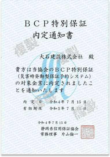 『事業継続計画Business continuity planning』(BCP)は災害、事故、事件等で当社の社員・勤務者・社屋・設備・施工中の現場・協力会社などに相当な被害を受けても重要業務をなるべく中断せず、また例え中断しても許容される時間内に復旧できるようにするものであります。当社は榛南地域で建設業を営むものとし、災害・事故等が発生した場合にはできる限り地域の救助、復旧活動に努め地域の期待に応え続ける企業でなければなりません。また従業員やその家族、関係先各位の為にも当社が相当な被害を受けても継続的経営に努め必要とされる企業であり続ける必要があります。